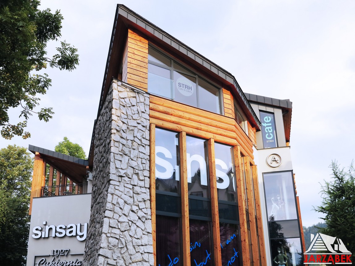 Budynek handlowo-usługowy to kompleksowa realizacja o unikalnej, nowoczesnej architekturze znajdująca się w ścisłym centrum Zakopanego przy ul Krupówki 4A. Prace obejmowały realizację obiektu wraz z pełnym wykończeniem elewacji oraz wnętrz, montażem wszelkich instalacji, budowę stacji TRAFO, oddanie budynku do użytkowania. Funkcjonalny obiekt, skupia w sobie cztery naziemne, usługowe kondygnacje oraz obszerną część piwnic, poniżej poziomu gruntu. Konstrukcja obiektu to charakterystyczne połączenie technologi żelbetu z elementami konstrukcji stalowej oraz więźbą dachową wykonaną z drewna i stali. Pokrycie dachu o różnorodnych spadkach stanowi blacha płaska z rąbkiem stojącym. Wykończenie elewacji to kompromis nowoczesnych materiałów budowlanych oraz stolarki aluminiowej z tradycyjnymi elementami z drewna modrzewiowego.